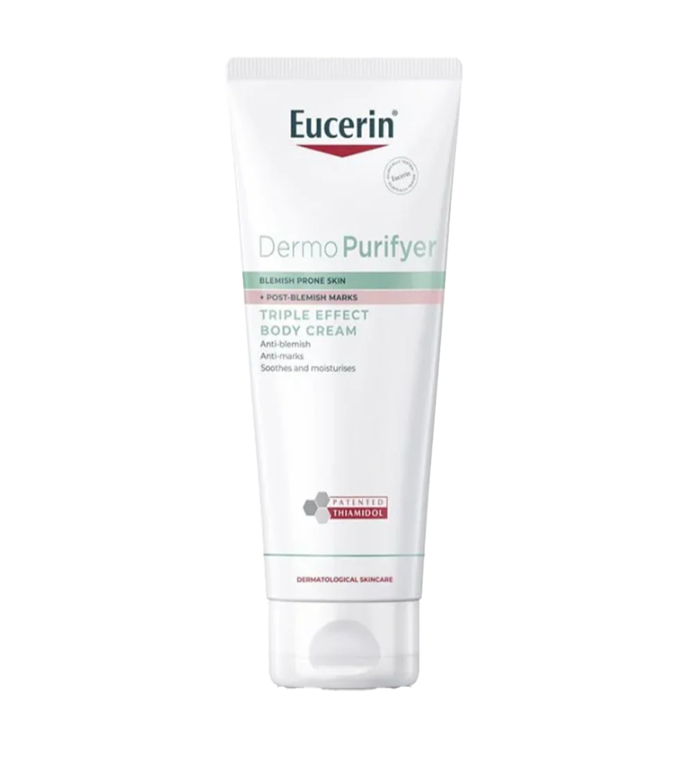 Eucerin DermoPurifyer Triple Effect Body Cream is specially formulated to address blemishes and post-acne marks on the chest, back, and shoulders. Powered by Salicylic Acid and patented Thiamidol®, it helps reduce breakouts, fade discoloration, and prevent their reappearance. The formula includes Licochalcone A to soothe irritation and Glycerin to deeply hydrate the skin. This dermatologically tested cream delivers visible results: 97% of users reported fewer blemishes and marks, 98% saw refined pores, and 100% experienced instant hydration and comfort. Suitable for daily use on blemish-prone skin.