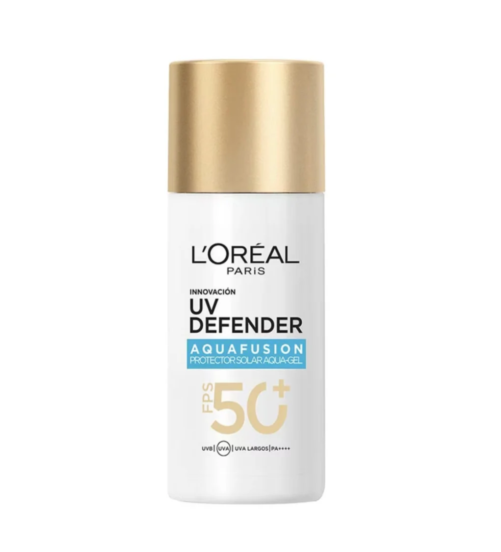The L’Oréal Paris UV Defender Aquafusion Daily Water Gel Sunscreen SPF50+ is a lightweight, fast-absorbing (in 3 seconds), water-gel formula providing high SPF50+ broad-spectrum UV protection, ideal for daily use under makeup due to its non-greasy, non-sticky finish and no white cast.